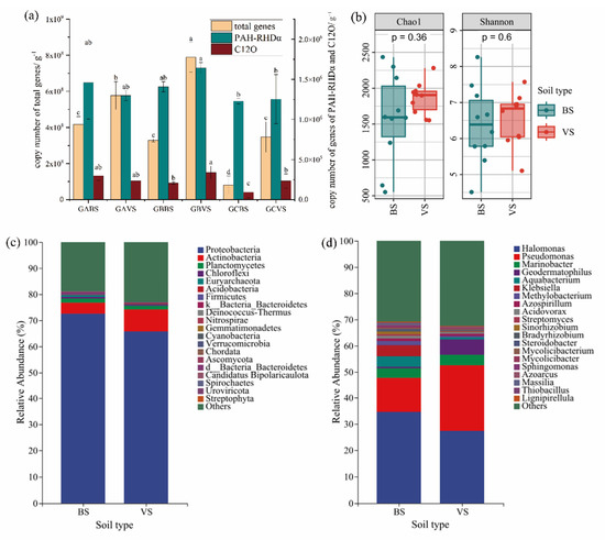Functional bacterial communities carrying PAH-RHDα and C12O genes. (a) Copy numbers of total bacteria represented by 16S rRNA genes and functional bacteria represented by genes of PAH-RHDα and C12O. (b) Alpha diversity index of bacteria carrying C12O genes from vegetated and bare soils. (c) Community structure of bacteria carrying C12O genes at genus level. (d) Community structure of bacteria carrying C12O genes at phylum level. Error lines showed standard deviations of three replicates of the same sample. Letters above error lines indicated significant difference between sampling sites (p < 0.05).