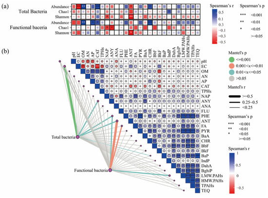 Correlations between environmental factors and the bacterial communities. (a) Spearman correlations between environmental factors and the abundance and diversity index of the total and functional bacteria. (b) The Spearman correlations between soil properties and contaminants are shown in the upper right corner, and the Mantel correlations (based on Bray–Curtis dissimilarity) between the total and functional bacterial communities and the environmental factors are shown in the lower left corner.
