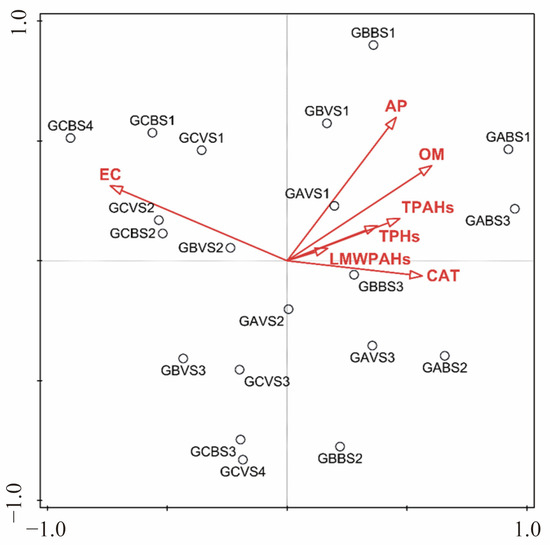 The physicochemical properties of soils were determined according to the standard methods recommended by the Ministry of Ecology and Environment of the People’s Republic of China [19]. The determination of all soil samples was carried out by random sampling, and each sample was repeated three times. The pH values were determined at a 1:2.5 ratio (sample–0.01 M CaCl2 solution, w/v) by a calibrated pH meter (SevenExcellence, MettlerToledo, Shanghai, China). Soil salinity was measured in a deionized water suspension (1:5, sample–water, w/v) by a calibrated electronic-conductivity (EC) meter (SevenExcellence, MettlerToledo, Shangai, China). The loss on ignition method, measuring the percentage of weight loss, was employed to quantify the organic matter (OM) content in soil samples [20]. The available nitrogen (AN) was determined by the Kjeldahl nitrogen determination method, and the available phosphorus (AP) was determined by the Olsen-P method, referring to Wang et al. [21]. The soil catalase (CAT) was extracted from prepared soil samples by enzyme kits (CAT 100, Sigma-Aldrich, Schnelldorf, Germany), the enzyme activities of which were obtained using a microplate spectrophotometer (iMark, BIO-RAD, Hercules, CA, USA) [22]. Ultrasonic-assisted solvent extraction and a GC-FID system were applied to determine the contents of total petroleum hydrocarbons (TPHs) [23]. A system of high-performance liquid chromatography (HPLC) equipped with a fluorescence detector (Agilent, Santa Clara, CA, USA) was utilized to analyze PAH concentrations, and the specific operation method can be found by referring to Li et al. [24]. Following the method reported by Sun et al. [25], the BaP-based total toxic equivalent quantity (TEQBaP) was calculated.