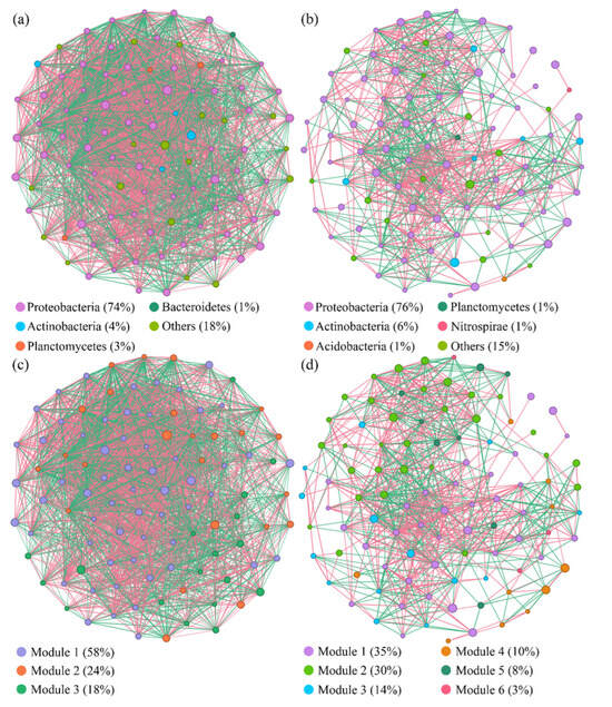 Co-occurrence networks of bacterial communities carrying C12O genes in the vegetated (a,c) and bare (b,d) soils. Nodes in the diagram represent different phyla (a,b) and different modularity classes (c,d). The red line represents a positive correlation between bacteria, while the green line represents a negative correlation.