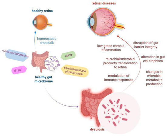 Beyond well-characterized host–microbiota interactions and associated pathologies, contemporary research has increasingly focused on the intricate interplay between gut microbiota and retinal health. The emerging concept of the gut–retina axis postulates that the gut microbiota exerts a regulatory influence on retinal homeostasis, underscoring its potential significance in ocular physiology and disease progression [7,16]. As depicted in Figure 2, this homeostatic crosstalk could be affected by numerous stressors, such as nutritional imbalances, drug assumption, aging, and psychological and physical stress, which cooperate in the onset of dysbiosis. This paradigm has prompted intensive investigation into the underlying mechanisms, particularly in the context of potential therapeutic interventions and nutritional strategies [76,77].