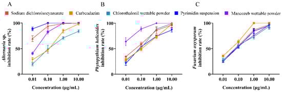 2.6. Inhibitory Effect of Different Drugs on Pathogenic Endophytic Fungi