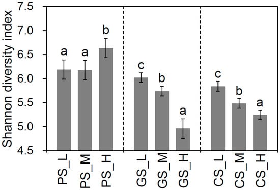 Figure 1. Shannon’s diversity indices for all residue incorporation treatments. CS, Quaternary red clay soil; GS, granite soil; PS, purple sandy shale; PM, parental material; L, low-C/N-ratio residue incorporation; H, high-C/N-ratio residue incorporation; M, mixed-residue incorporation with low- and high-C/N-ratio residues. Different letters indicate significant differences (p value < 0.05) between residue incorporation treatments within each type of parent material according to Duncan’s multiple-comparison test.