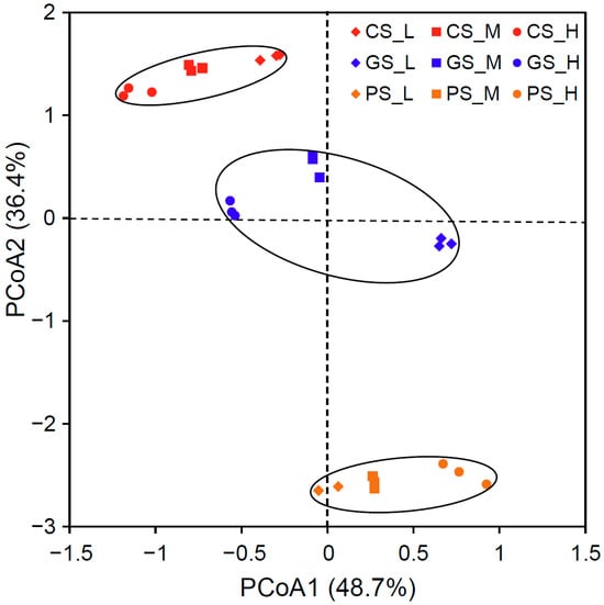 Principal coordinates analysis (PCoA) revealed distinct separation patterns along orthogonal axes (Figure 2), with the first principal coordinate explaining 48.7% of the total variance and segregating communities primarily by residue C/N ratio (Mantel test r = 0.592, p < 0.001). This axis differentiated high-C/N (H) and low-C/N (L) treatments into discrete clusters, suggesting that the stoichiometric properties of organic inputs fundamentally restructured microbial assemblages. The second principal coordinate, accounting for 36.4% of variance, partitioned communities according to parent material type (CS, GS, PS) (Mantel test r = 0.376, p < 0.001), indicating that inherent pedogenic differences modulated treatment-specific responses.