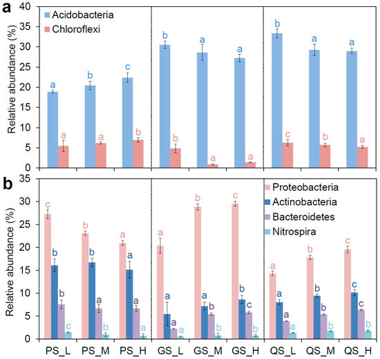 Figure 3. (a) Relative abundance of Acidobacteria and Chloroflexi in all residue incorporation treatments. (b) Relative abundance of Proteobacteria, Actinobacteria, Bacteroidetes, and Nitrospira in all residue incorporation treatments. CS, Quaternary red clay soil; GS, granite soil; PS, purple sandy shale; PM, parental material; L, low-C/N-ratio residue incorporation; H, high-C/N-ratio residue incorporation; M, mixed-residue incorporation with low- and high-C/N-ratio residues. Different letters indicate significant differences (p value < 0.05) between residue incorporation treatments within each type of parent material according to Duncan’s multiple-comparison test.