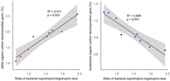 Figure 4. The relationships between the ratio of bacterial copiotrophic/oligotrophic taxa and the labile (left) or recalcitrant (right) organic carbon decomposition gene. The ratio of bacterial copiotrophic/oligotrophic taxa was calculated by dividing the total relative abundance of Proteobacteria, Actinobacteria, Bacteroidetes, and Nitrospira by the relative abundance of Acidobacteria and Chloroflexi.