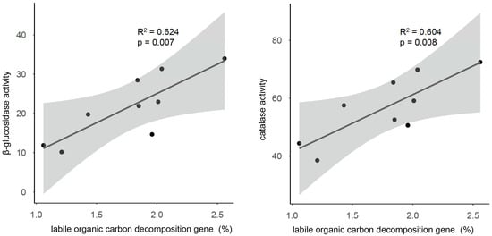 Figure 5. The relationships between the labile organic carbon decomposition gene and the β-glucosidase (left) and catalase activity (right).