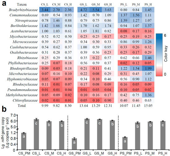 Figure 6. (a) Relative abundance (%) of N-fixing bacterial family in all residue incorporation treatments. Color scale from greatest (blue) to lowest (red) relative abundances within same type of soil. (b) Lg-transformed nifH gene copy under all residue incorporation treatments based on qPCR. Different letters indicate significant differences (p value < 0.05) between residue incorporation treatments within each type of parent material according to Duncan’s multiple-comparison test. CS, Quaternary red clay soil; GS, granite soil; PS, purple sandy shale; PM, parental material; L, low-C/N-ratio residue incorporation; H, high-C/N-ratio residue incorporation; M, mixed-residue incorporation with low- and high-C/N-ratio residues.