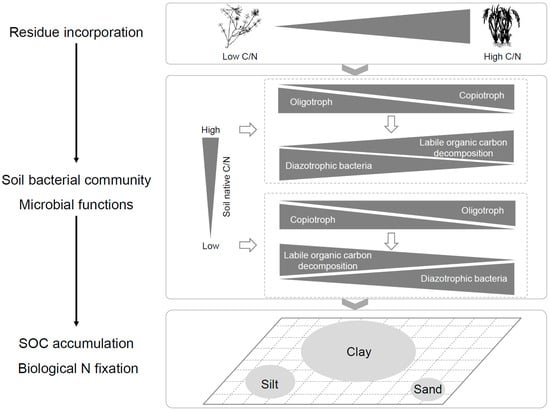 In summary, the results for how SOC distribution and diazotrophic bacterial communities respond to residue incorporation in three types of soil parent material indicate that SOC is more easily retained and accumulated in clay in the early stage of soil development. In addition, the soil native C/N ratio markedly affects the SOC accumulation, the composition of the diazotrophic bacterial community, and the N fixation potential, which are mechanistically linked to stoichiometry-driven microbial niche partitioning (Figure 7). Our findings highlight the contribution of Bradyrhizobiaceae, Rhodospirillaceae, Micrococcaceae, Rhizobiaceae, Comamonadaceae, Nitrospiraceae, and Burkholderiaceae to N accumulation during soil maturation, particularly through their association with clay-associated SOC and TN pools. These results establish a critical connection between native and residue C/N ratios and soil C sequestration and biological N fixation at the particle level. Further work should explore the long-term interplay between soil-inherent and externally added C/N sources and their cascading effects on microbial community dynamics in agroecosystems.