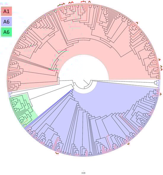 Maximum-likelihood (ML) phylogenetic tree of HIV-1 subtype A sequences. The ML tree was reconstructed using IQ-TREE v1.6.12 with a total of 398 sequences: 132 Bulgarian sequences, 22 reference subtype sequences, and 244 specifically selected sequences. The analysis covered 905 nucleotide positions. Background colors indicate the clustering of HIV-1 sub-subtypes: blue represents sub-subtype A6, green represents sub-subtype A7, and pink represents sub-subtype A1. Clades without background shading represent reference sequences outside of these three sub-subtypes. Bulgarian sequences are colored in red, reference sequences in blue, and sequences from BLAST and the specially selected set from the Los Alamos database are shown in black. Red brackets on the phylogenetic tree indicate phylogenetic clusters involving Bulgarian sequences, and the purple bracket indicates a cluster involving two sequences, one Bulgarian and one Croatian.