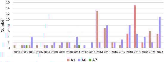 In contrast, sub-subtype A6, shown in blue in Figure 2, was relatively frequently encountered during the earlier years, particularly between 2005 and 2014. After 2015, its frequency stabilized, with notable occurrences in 2019 and 2022 but without evidence of a significant upward or downward trend. These findings indicate that both sub-subtypes A6 and A1 fluctuate and have uneven increases and decreases over the years.