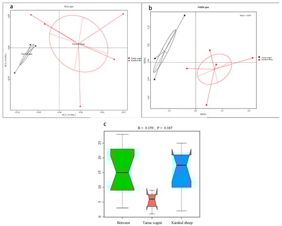 Beta diversity analysis of rumen microorganisms in Tarim wapiti and Karakul sheep; (a) PCoA (principal coordinate analysis) analysis; (b) NMDS (non-metric multidimensional scaling) analysis; (c) ANOSIM analysis.