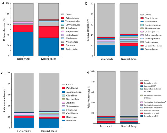The relative abundance of microbial in the rumen of Tarim Wapiti and Karakul sheep. (a) phyla level. (b) family level. (c) gene level. (d) bacterium level. Note: ** indicate significant differences (p < 0.01), * indicate significant differences (p < 0.05).