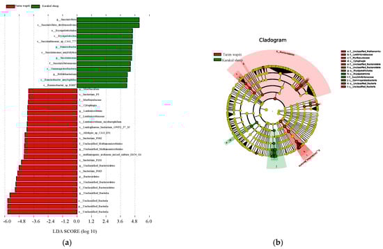 LEfSe study of significant biomarker differences between Tarim wapiti and Karakul sheep; (a) LDA value > 3. (b) The classification level of the circle from the outside to the inside is in order of phyla, class, order, family, genus, and species. Different color points in the phylogenetic tree stand for bacteria which are important in each group, respectively. Yellow points indicate taxa, which have no significant differences among groups.