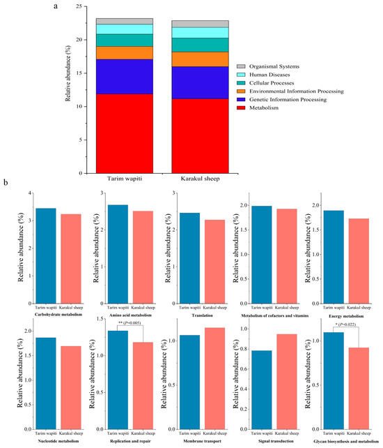 Annotated changes in KEGG functions of rumen microbes between Tarim wapiti and Karakul sheep; (a) KEGG pathway level 1; (b) KEGG pathway level 2.