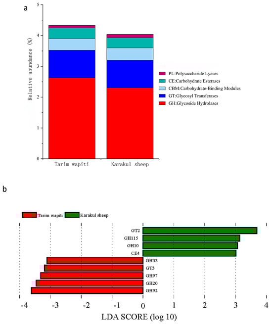 Comparison of CAZyase functional annotations in rumen microorganisms from Tarim wapiti and Karakul sheep. (a) Functional annotation of CAZyase at level 1; (b) distribution of LDA values for CAZyase differences (LDA score > 3).