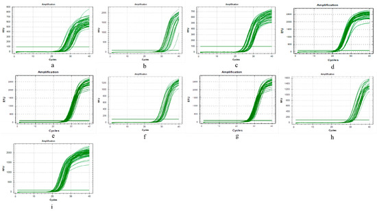 qRT-PCR amplification curves for related vectors and proteins. (a) PAT1; (b) DRA; (c) AE2; (d) MCT1; (e) MCT2; (f) Na+/K+ ATPase; (g) NHE3; (h) NHE4; (i) GAPDH.