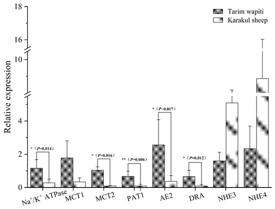 The 2-ΔΔCT method was used to calculate the relative mRNA expression of each vector and protein, with GAPDH as the internal reference. The Tarim wapiti’s rumen epithelium showed significantly higher expression of the relevant vectors PAT1, DRA, AE2, and MCT2, as well as the relevant proteins Na+/K+ ATPase involved in pH regulation, compared to the Karakul sheep (p < 0.05 or p < 0.01) (Figure 7).
