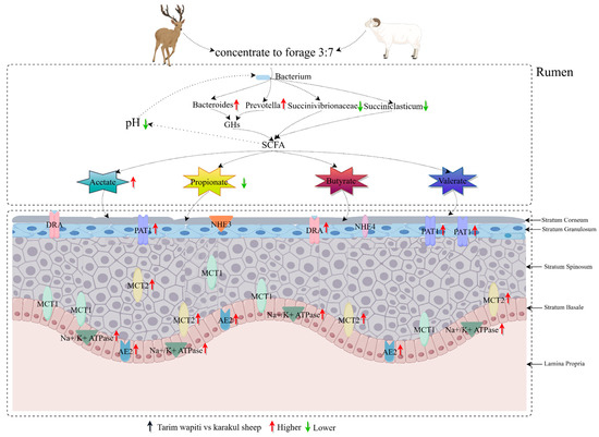 The rumen epithelium of sika deer was reported to express MCT1 and MCT4 [82]. In this study, we discovered that the related vectors PAT1, DRA, AE2, and MCT2 involved in SCFA absorption, as well as the related protein Na+/K+ ATPase involved in pH regulation, were expressed in the rumen epithelium of Tarim wapiti, and the relative expressions were also significantly higher than that in Karakul sheep, with no significant differences in relative expressions of MCT1, NHE3, and NHE4. This indicated that the Tarim wapiti has a higher absorption capacity for short-chain fatty acids. It was discovered that dietary fiber levels influenced the amount of short-chain fatty acids in the rumen, which in turn changed the expression levels of AE2, MCT1, and Na+/K+ ATPase [82]. In the current investigation, the feeding levels of both animals were identical. Theoretically, the Tarim wapiti’s rumen epithelial short-chain fatty acids absorption capacity was greater than that of Karakul sheep, and the rumen short-chain fatty acids content should have been lower, but the rumen short-chain fatty acids content of Tarim wapiti was higher than that of Karakul sheep. As a result, it is claimed that Tarim wapiti rumen bacteria fermented the diet more than Karakul sheep. As a result, we integrated rumen microorganisms, short-chain fatty acids, and rumen epithelial short-chain fatty acids uptake and transport-related vectors to reveal that the Tarim wapiti has greater rumen microbe–short-chain fatty acids–epithelial linkages.