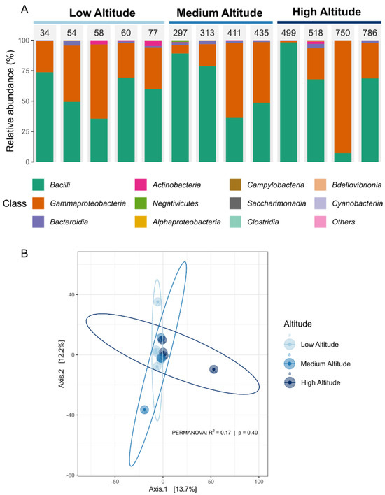 Microbial distribution and beta diversity. (A) Frequencies of the ten most abundant classes in each sample by altitude. (B) Overall comparisons of samples based on principal coordinate analysis (PCoA) measured by the Euclidean distance. Points closer to each other represent similar microbial communities, while points farther from each other represent dissimilar microbial communities. The statistical significance for the differences among altitudes was calculated by per MANOVA and is shown in the figure.