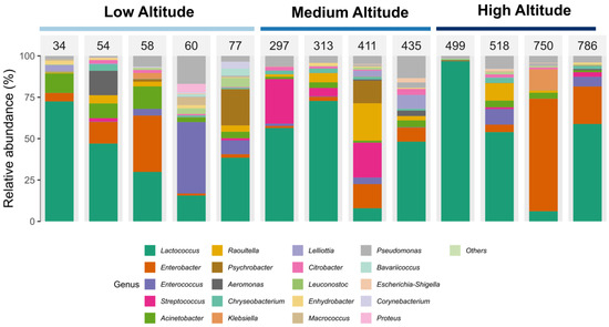 The analysis of the taxonomic distribution at the genus level (Figure 3) in the samples from different altitudes revealed high microbial diversity, without identifying a consistent pattern associated with altitudinal variation. The genus Lactococcus was the most abundantly represented in most samples, regardless of altitude, followed by occasional increases in Enterococcus. A higher prevalence of the genera Streptococcus was also observed at medium altitudes and of Enterobacter at high altitudes. The absence of a homogeneous microbial profile among the samples suggests that the cheeses analyzed were not subjected to pasteurization and that there was no addition of industrial starter cultures composed of standardized strains during the fermentation process.
