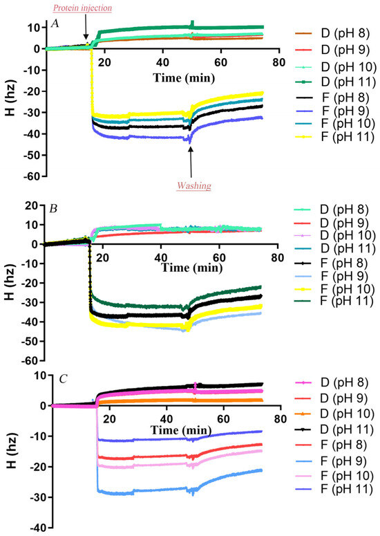 QCM-D measurements were conducted at 5 °C to maximally suppress enzymatic activity. This approach prevented polymer degradation during adsorption, ensuring that mass changes reflected only protein adsorption. A glycine–NaOH buffer (0.05 mol L−1, pH 8.0–11) was injected into the chamber until the baseline was stabilized. Diluted AfCutA or AfCutB solutions were then loaded into the chamber at a flow rate of 0.1 mL/min. Once equilibrium adsorption was achieved, the buffer solution was introduced to remove the reversibly adsorbed protein. All experiments were repeated at least three times. Changes in resonance frequency (Δf) and energy dissipation (ΔD) were recorded at a fundamental resonance frequency of 5 MHz and the third, fifth, seventh, and ninth overtones. The third overtone (15 MHz) was selected for data processing. Surface adsorption on the films was calculated according to the Sauerbrey equation [27].