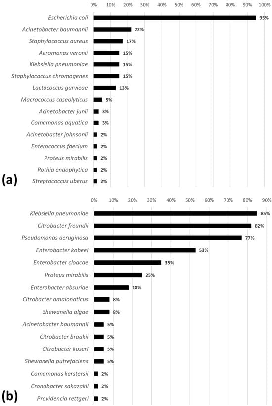 Of the 1220 colonies with distinct morphotypes, 30 genera, including 49 species of bacteria, were identified (Figure 1). The carcasses were predominantly contaminated with Gram-negative bacteria, including E. coli (95%), Klebsiella pneumoniae (85%), Citrobacter freundii (82%), Pseudomonas aeruginosa (77%), and Enterobacter kobei (53%).