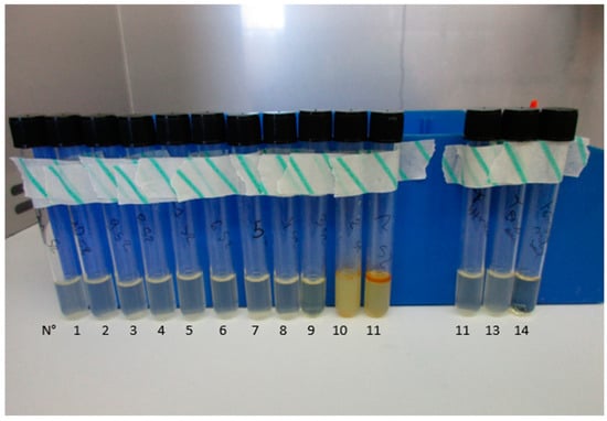 Macrodilution test tubes of EO mix at progressive 2:1 ratio dilutions against E. coli; EO mix concentrations are as follows in numerated tubes: n°1 9.77 × 101 μg/mL, n°2 1.95 × 102 μg/mL, n°3 3.91 × 102 μg/mL, n°4 7.81 × 102 μg/mL, n°5 1.60 × 103 μg/mL, n°6 3.10 × 103 μg/mL, n°7 6.20 × 103 μg/mL, n°8 1.25 × 104 μg/mL, n°9 2.50 × 104 μg/mL, n°10 5.00 × 104 μg/mL, n°11 1.00 × 105 μg/mL; tube n°11 is negative control (MHB+ E. coli), tube n°12 is E.coli + DMSO 1% + MHB, tube n°14 is MHB.