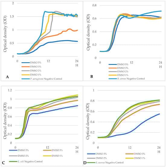 DMSO at 5% concentration impacted the growth of all bacterial strains (see Figure 2A–D).