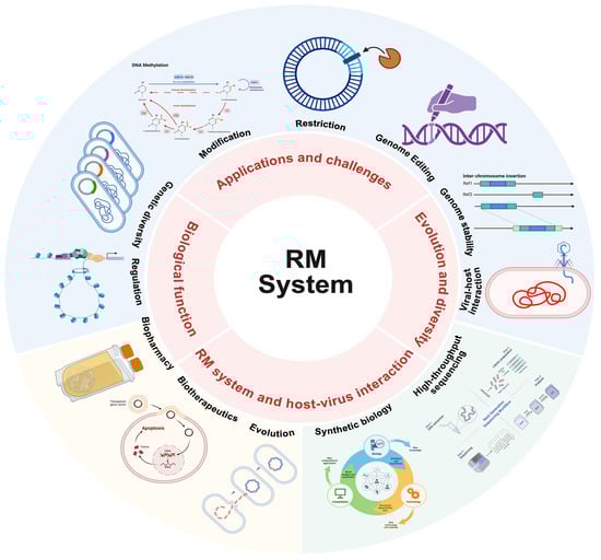 Restriction–modification systems (RMS) are fundamental adaptive mechanisms in microbial genetics, providing crucial defense against exogenous genetic threats and playing a pivotal role in microbial genomic evolution. These systems, which encompass both restriction enzymes and modification enzymes, have been instrumental in shaping our understanding of microbial genomic integrity and have had profound implications for both evolutionary biology and molecular biotechnology. The discovery of restriction enzymes by Arber, Smith, and Wilcox in the early 1960s and 1970s marked a transformative moment in molecular genetics, offering the first reliable tools for manipulating DNA [1,2]. This breakthrough also unveiled an intricate array of microbial protective strategies against phages and plasmids, significantly advancing our knowledge of microbial defense systems and their roles in genomic stability [3].