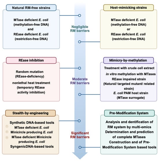 Strategies for overcoming genetic barriers in bacteria imposed by RM systems. Current methods either produce a methylation that is surrounded by the hosts endogenous (in vitro) or implanted methylome (ex vivo), with this functionally achieving some level of mimicry via methylation. SyngenicDNA approaches, on the other hand, circumvent RM systems by deleting their target recognition sequences from DNA to generate minimalistic (RM-silent) genetic tools and thereby implement stealth-by-engineering during transformation. The pre-modification system strategy involves using multi-omics analysis to fully investigate the RM expression profile of the desired strains. By introducing the cloning host strain and pre-modifying all RM recognition sites during plasmid construction, it rapidly achieves complete evasion of the RM barriers of desired strains.