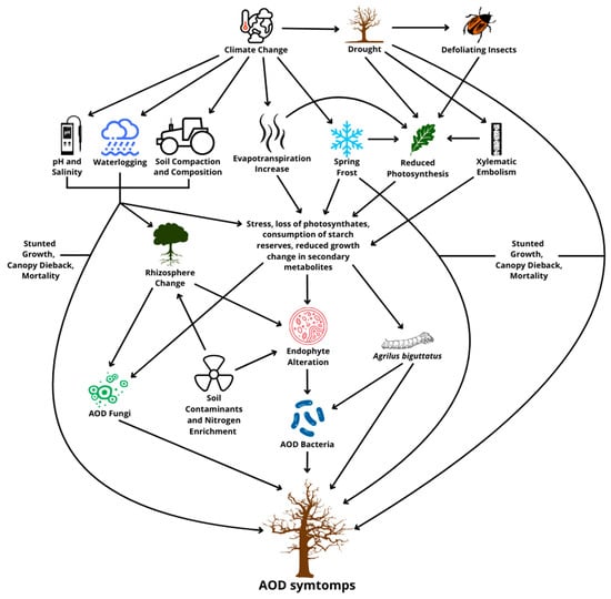 AOD is a relatively new phenomenon that is particularly complex, but its exact nature is unclear at present due to the co-participation of numerous abiotic and biotic factors. It has been pointed out that there are still several gaps in the general understanding of the disease, which increases the risk of AOD spreading undisturbed and control strategies being applied too late. In this sense, it is crucial to emphasize the importance of additional study in this field to better understand the disease’s causes and interactions, as well as the possibilities for control. In this regard, an interdisciplinary approach integrating ecology, microbiology, entomology, and forestry could prove crucial in addressing the complexity of AOD and identifying more effective solutions.