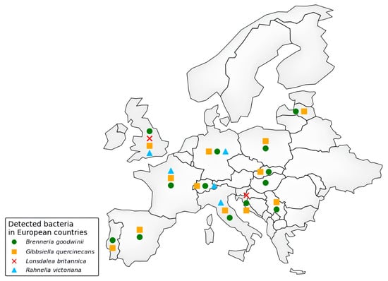 Distribution of AOD-associated bacteria in European countries (according to Scopus and EPPO databases, last access 17 March 2025).