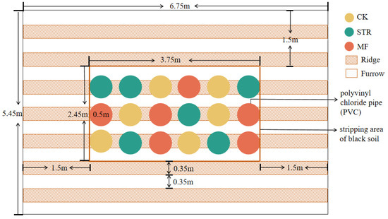 The field experiment plots included two treatments (STR and MF) and a control group. We used a randomized complete block design with six replications. The MF treatment was 1.5 t/hm2, with an average organic matter content of 47 g/kg. The STR treatment consisted of applying crushed maize straw at a rate of 10 t/hm2, with an average total organic carbon content (TC) of 44 g/kg and total nitrogen content (TN) of 4 g/kg. The manure fertilization and crushed corn straw were evenly incorporated into the 0–20 cm soil layer in autumn 2022. Ten soybeans were planted in each plot, combining the regional survey data, and the same field managements were applied to all the plots. Inorganic fertilizer was applied to the treatment and control plots based on the typical fertilizer amount in the area at 20.25 kg N/ha, 51.75 kg P/ha, and 15.00 kg K/ha to provide soil nitrogen, phosphorus, and potassium [9,30].