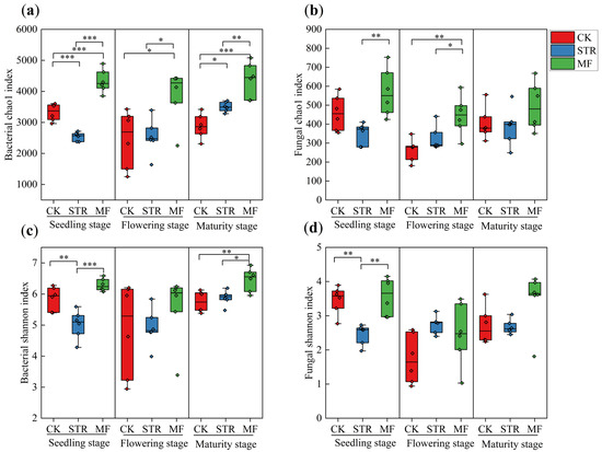 STR significantly reduced soil fungal alpha diversity in the seeding stage, whereas no significant differences were observed in the flowering and maturity stages (Figure 2b,d). No significant differences in the alpha diversity of soil fungi were observed between MF and CK during the growing season (Figure 2b,d).
