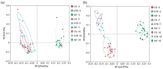 Principal coordinate analysis of soil bacterial (a) and fungal (b) communities under the addition of different organic materials (PCoA). Note: CK: the control treatment without the additions of straw and manure fertilization; STR: Straw returning; MF: Manure fertilization; S, F, M, represent the seedling, flowering, and maturity stages, respectively.
