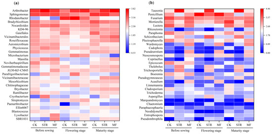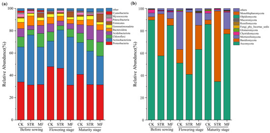 The PCoA revealed significant differences in bacterial and fungal communities among the treatments (Figure 3). PC1 and PC2 accounted for 29.62% and 12.50% of the total variance in bacterial community structure (Figure 3a) and 16.97% and 10.84% of the variance in fungal community structure, respectively (Figure 3b). The bacterial and fungal communities of the CK group and the STR treatment were widely separated from those of the MF treatment along the PC1 axis, suggesting similar microbial community structures in the CK and STR. Thus, we classified them into CK + STR and MF groups. Significant differences in the soil bacterial community were observed between samples collected at different times (seedling stages and flowering stages). However, the fungal communities at the seeding and maturity stages clustered together and were distinct from those at the flowering stage, indicating that the crop growth period significantly affected soil microbial community structure.