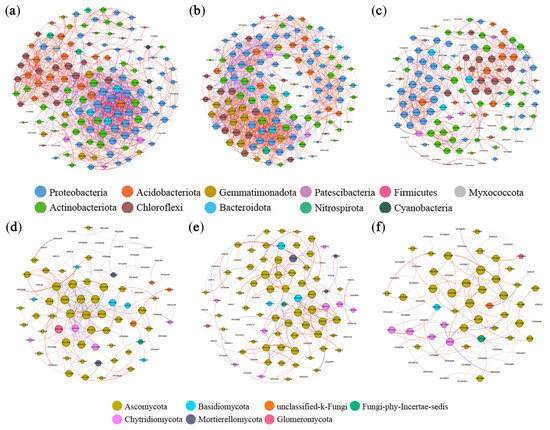 Co-occurrence network of soil bacteria and fungi under the application of straw return and manure fertilization: (a) Bacterial CK; (b) Bacterial STR; (c) Bacterial MF; (d) Fungal CK; (e) Fungal STR; (f) Fungal MF. Nodes represented operational taxonomic units (OTUs) color-coded by different phyla and scaled proportionally to the number of connections (node degrees). Edges represented correlations between OTUs and were scaled proportionally to the weight of the edge. Connection lines at r > 0.7 (positive correlation, red) or r < −0.7 (negative correlation, blue) and p < 0.01.