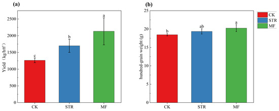 The STR and MF treatments significantly increased (p < 0.05) soybean yield by 34.52% and 68.8%, respectively (Figure 7). The hundred-grain weight of soybean was significantly higher in MF than in CK (p < 0.05), whereas no significant difference was found between the STR treatment and the CK.