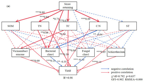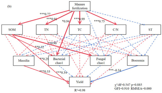 The structural equation model reveals the relationship between straw returning (a), manure fertilization (b). Note: ST: soil temperature; TC: soil total carbon; TN: soil total nitrogen; C/N: soil carbon-nitrogen ratio; SOM: soil organic matter. The red arrow indicates positive correlation and the blue arrow indicates negative correlation. Solid lines indicate significant correlation, dotted lines indicate insignificant, *, ** and *** represent p < 0.05, p < 0.01 and p < 0.001, respectively, and the width of the arrow is proportional to the intensity of the path coefficient.