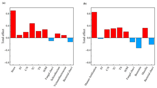 Soil physical and chemical properties and microbial properties, and crop yield. (a,b) are the total impact of different variables on yield. Note: ST: soil temperature; TC: soil total carbon; TN: soil total nitrogen; C/N: soil carbon-nitrogen ratio; SOM: soil organic matter. The red bar represents the positive effect and the blue bar represents negative effect, respectively.