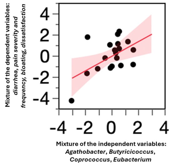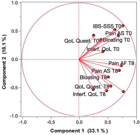 The Wilcoxon Signed-Rank test was adopted to analyzed the “after versus before” results of the individual primary clinical outcomes of the prospective group (BSS, stool frequency, episodes of diarrhea, pain, bloating, bowel movements dissatisfaction, interference with QoL, IBS-SSS, and QoL). To reduce the risk of type I errors resulting from multiple comparisons and to evaluate the possible correlation between the clinical outcomes, principal component analysis (PCA) was used. PCA transforms a set of correlated variables into a new set of uncorrelated variables (principal components), while maintaining the maximum variance in the data. Particularly, this process can be beneficial for (i) dimensionality reduction (by reducing the variables to a few relevant principal components, the number of tests to be performed can be reduced, thus reducing the probability of incurring type I errors); (ii) removal of collinearity (PCA can mitigate the problem of multicollinearity between variables, improving the robustness of statistical models) [29,30]. To compare the biodiversity and taxonomy revealed by the gut microbiota analysis, we used, respectively, a paired t-test and the Wilcoxon–Mann–Whitney test. To evaluate the relationships between the clinical outcomes and the α-biodiversity and the shift in the microbial taxa, Partial Least Squares Regression (PLSR) was adopted [31]. Last, to compare the clinical outcomes between the prospective and the retrospective group, the Wilcoxon–Mann–Whitney test (also called Mann–Whitney U test) was used. JMP 14 (JMP14 is manufactured by JMP Statistical Discovery LLC, at SAS Institute (Cary, NC 27513, USA)) statistical software for macOS was used, and statistical significance was set at 95%.