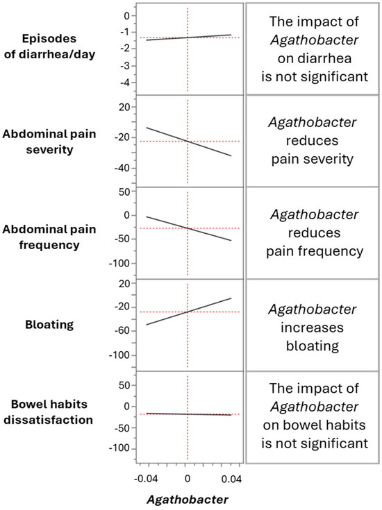Figure 4. Differential impact of Agathobacter on primary clinical outcomes. The X-axis represents the relative abundance of Agathobacter, while the Y-axis displays five different primary clinical outcomes, each scaled according to its respective measurement.