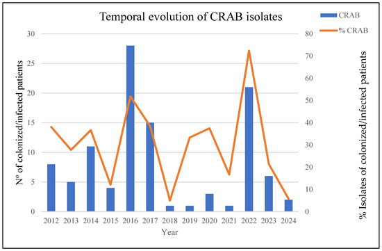 - Medioli, F.; Bacca, E.; Faltoni, M.; Burastero, G.J.; Volpi, S.; Menozzi, M.; Orlando, G.; Bedini, A.; Franceschini, E.; Mussini, C.; et al. Is It Possible to Eradicate Carbapenem-Resistant Acinetobacter baumannii (CRAB) from Endemic Hospitals? Antibiotics 2022, 11, 1015. [Google Scholar] [CrossRef] [PubMed]