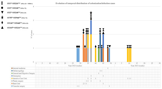 | Case | Age | Sex (M/F) * | Date of First Isolation | Sample | Diagnostic/Colonization | Clinical Ward Where the Sample Was Obtained |