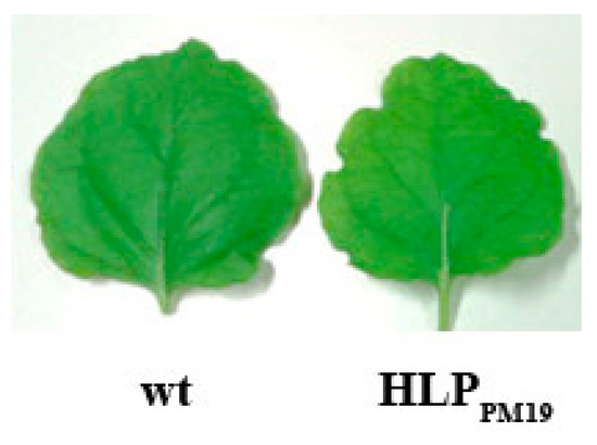 Leaves of transgenic N. benthamiana plants expressing HLPPM19 under the control of 35S promoter. No remarkably different phenotypes were observed between wild type (wt) and transgenic plant expressing HPLPM19 lines. The same results were also obtained from transgenic A. thaliana plants expressing HPLPM19 and HPLPM19∆TM under 35S and AtSUC2 promoter.