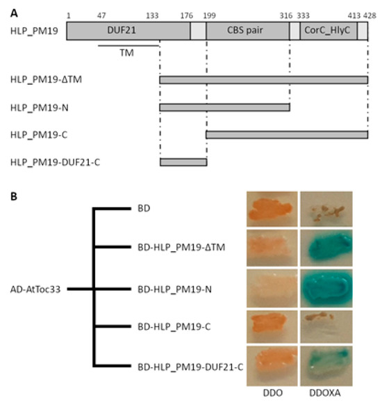 In Y2H, HLPPM19-ΔTM fused to the Gal4 binding domain (BD) was used for bait (expression plasmid pGBKT7-HLPPM19-ΔTM), and a normalized A. thaliana library (Takara Bio USA, Inc., Mountain View, CA, USA) fused to the Gal4 activation domain (AD) as prey (expression plasmid pGADT7). In total, 7.1 × 107 clones containing both prey and bait were screened for interaction upon resistance to antibiotic aureobasidin A (AbA), expression of α-galactosidase, and growth on media lacking histidine and adenine. One clone was found to activate all four reporter genes. Plasmid isolation and sequencing showed that the prey plasmid of this clone contained the full-length gene of the A. thaliana translocase of chloroplast 33 (AtToc33, accession number O23680).