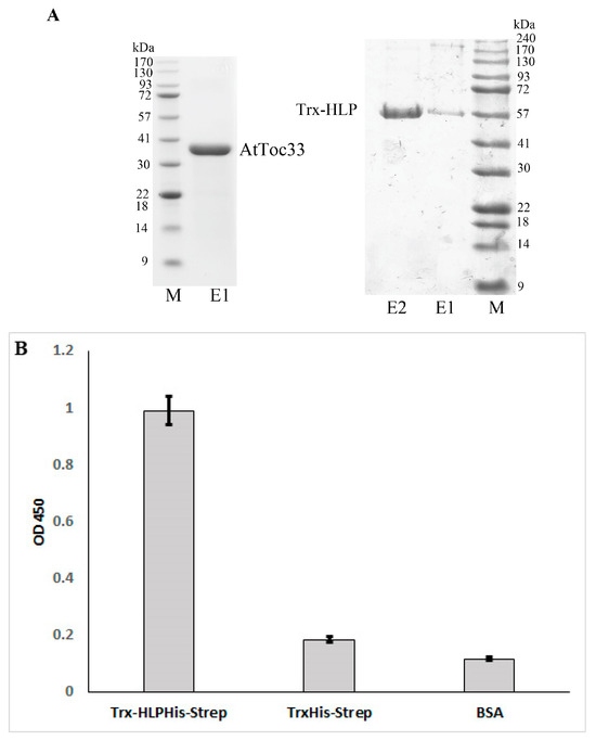 After protein expression in E. coli and purification using Ni-NTA resin, the purity of both proteins was determined by SDS-PAGE followed by coomassie brilliant blue staining (Figure 5A). The results showed that the protein samples of AtToc33ΔTM-R130A-His and Trx-HLPPM19-ΔTM-His-Strep showed high purity (Figure 5A); thus, they were further used for determining their binding affinities in an ELISA.