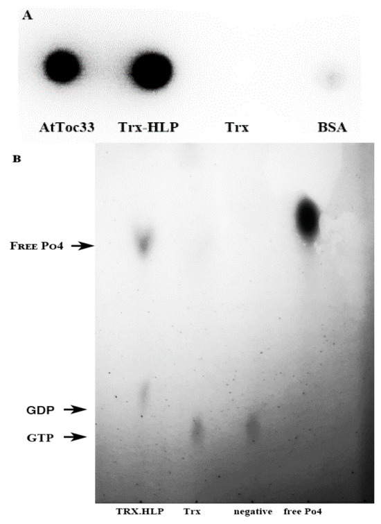 To test whether the HLPPM19 could bind GTP, we performed an in vitro GTP-binding assay, Trx-HLPPM19-ΔTM-His-Strep; AtToc33ΔTM-R130A-His as positive control and TrxHis-Strep and BSA for negative controls were incubated with radioactive labeled [α32P]GTP. Aliquots of the reactions were spotted on a nitrocellulose membrane, and unbound GTP was washed off. Bound [α32P]GTP was detected using a phosphor imager. The results in Figure 6A showed that the purified AtToc33ΔTM-R130A-His as well as Trx-HLPPM19-ΔTM-His-Strep were able to bind radioactive labeled [α32P]GTP, whereas TrxHis-Strep and BSA did not ). The result clearly suggests that HLPPM19-His-Strep is a GTP binder. It was further investigated whether the HLPPM19 could function as a GTPase by hydrolyzing GTP. In the GTPase activity assay, we used a non-radioactive approach by incubating Trx-HLPPM19-ΔTM-His-Strep with GTP in the assay reaction. After running the reaction in TLC, free phosphates were visualized using a molybdate–tin(II) chloride reagent. The result in Figure 6B showed that the free phosphates could only be detected in the reaction of Trx-HLPPM19-ΔTM-His-Strep. This suggests that Trx-HLPPM19-ΔTM-His-Strep not only binds GTP but also hydrolyzes GTP, releasing monophosphate.