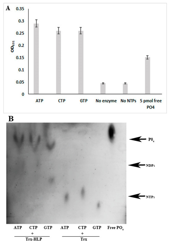 The results clearly showed that HLPPM19 binds and hydrolyzes GTP. We further questioned whether HLPPM19 specifically reacts with GTP or could bind and hydrolyze other types of nucleotides. To investigate whether the HLPPM19 could function as nucleosidase, the Trx-HLPPM19ΔTM-His-Strep was incubated with purine and pyrimidine nucleotides in hydrolysis reactions. After incubation, free phosphate was detected using molybdate–tin(II) chloride reagent (Figure 7A) or in TLC analysis (Figure 7B). The result showed that Trx-HLPPM19-ΔTM-His-Strep could indeed hydrolyze all nucleotides tested (Figure 7), suggesting that the HLPPM19 acts as a nucleosidase.
